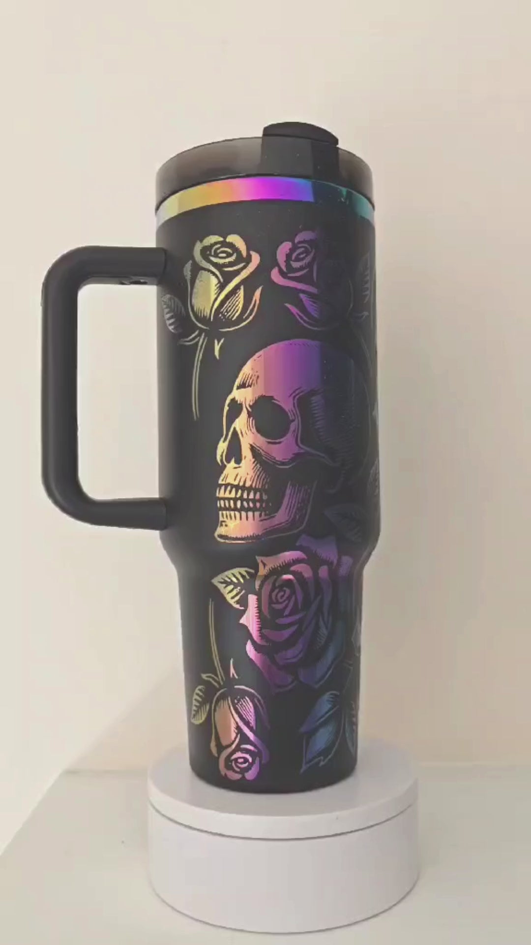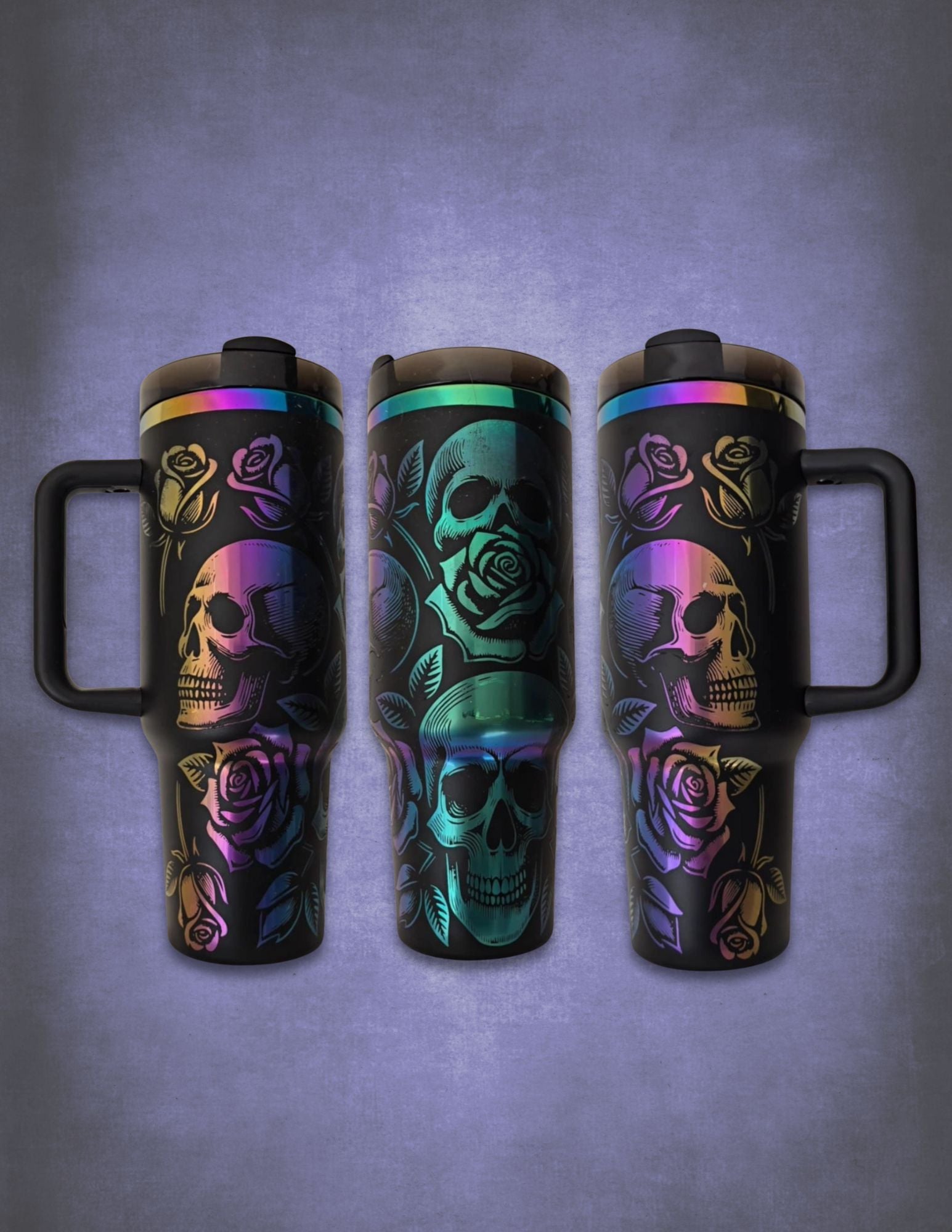 Bold, edgy, and beautifully detailed—this 40oz stainless steel tumbler features a laser-engraved skull and roses design, perfect for those who love a mix of dark and elegant. The engraving creates a striking, long-lasting finish that won’t fade or peel.