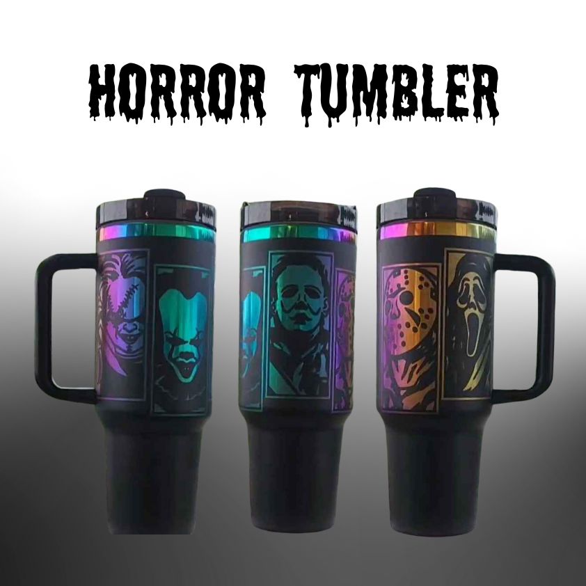 Sip in spooky style with our 40 oz double-walled stainless steel horror-themed tumbler! This hot/cold tumbler is designed to keep your beverages at the perfect temperature for hours and features spine-chilling engravings of classic horror icons—Chucky, Jason, Michael Myers, Ghostface, and Pennywise. Available with a unique oil-slick engraving effect, each tumbler is crafted for both style and durability. Complete with a straw, this insulated tumbler is perfect for horror fans who want to showcase their love for the genre in every sip.