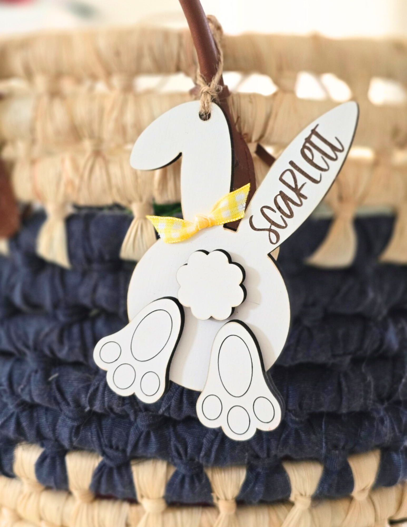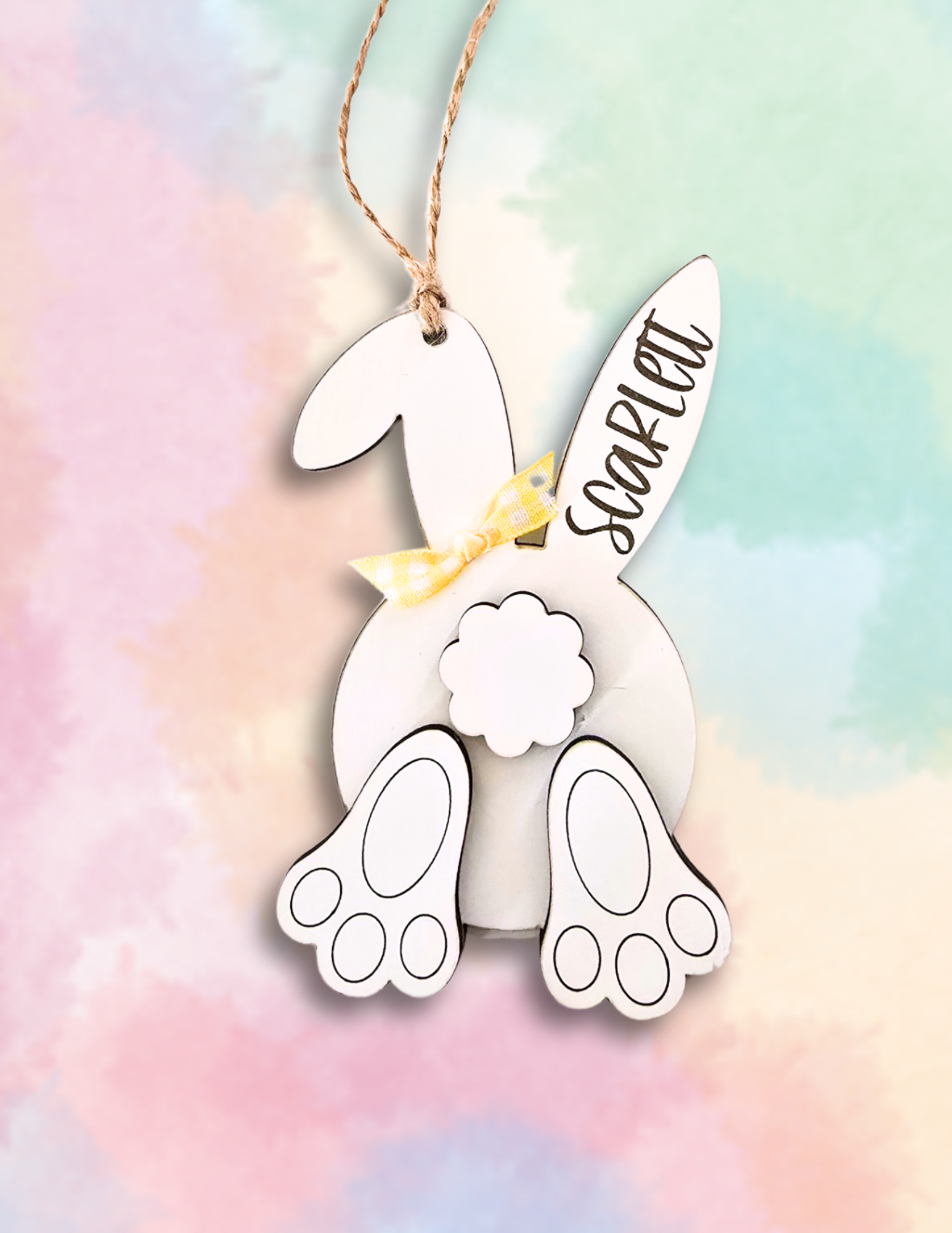 Add an extra touch of charm to your Easter baskets with this adorable Bunny Butt Tag! Made from layered wood and detailed with engraved bunny feet and a 3D tail, this tag features a cute bunny backside personalized with your child's name. It comes with a twine hanger and a festive ribbon accent, ready to tie onto any basket, bucket, or gift. A perfect keepsake for years to come!