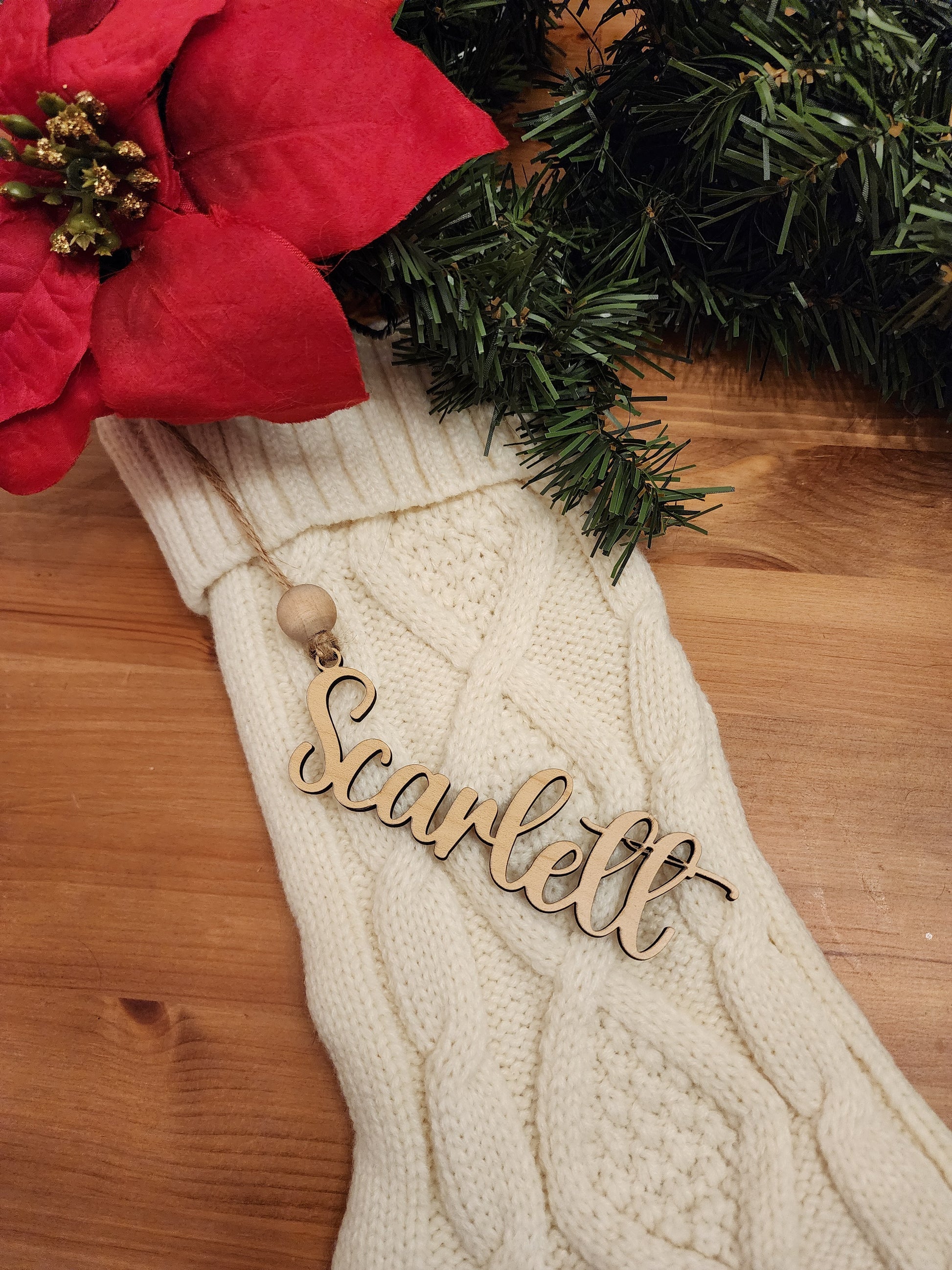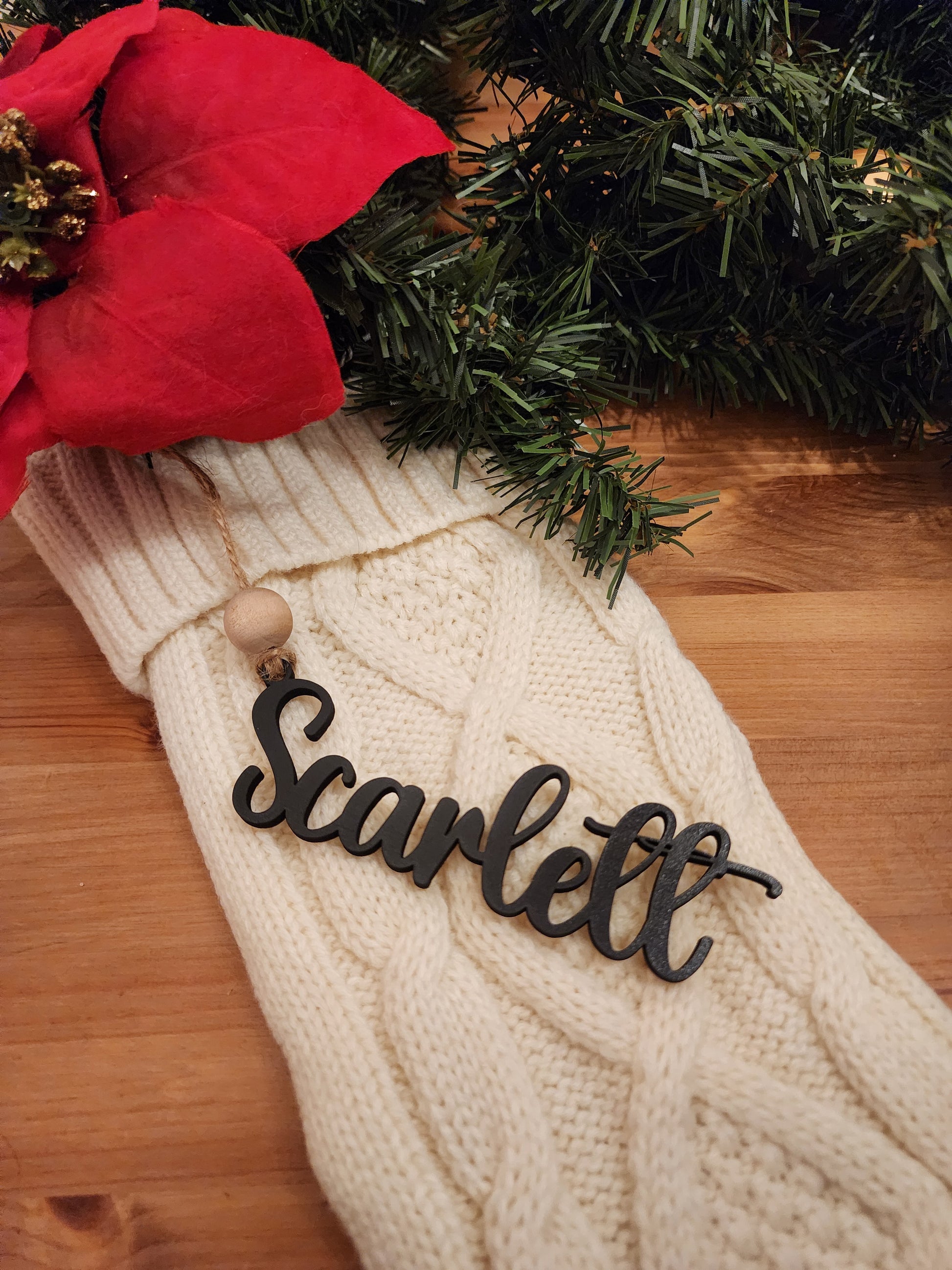 Add a personalized touch to your holiday decor with our custom laser-cut stocking/tree hangers. Crafted from Walnut, Black, White, or Maple materials, these delicate, backer-free hangers feature intricately laser-cut names that make each piece uniquely yours. Each hanger comes complete with your choice of a twine or suede loop, accented with a single natural wood bead for a simple, elegant finish.