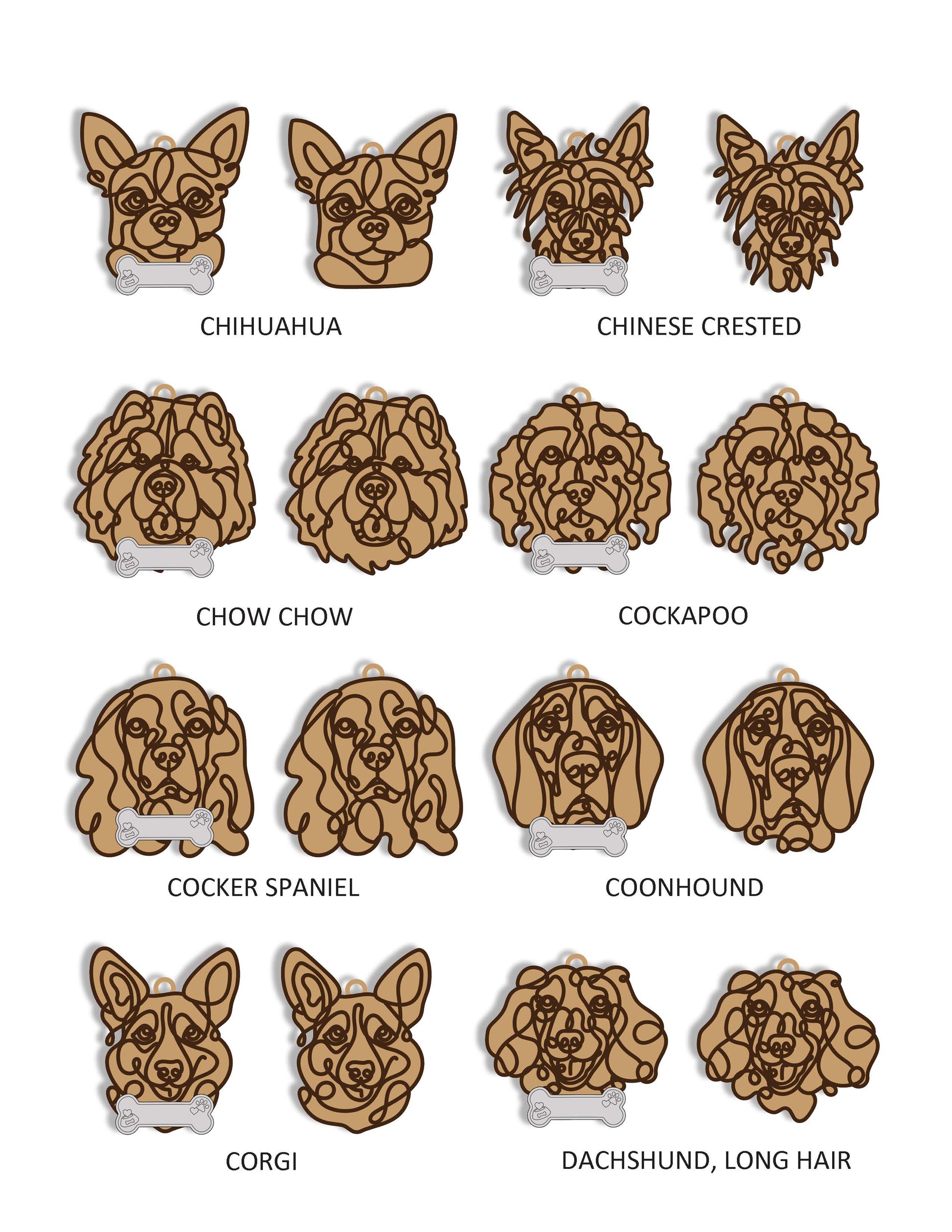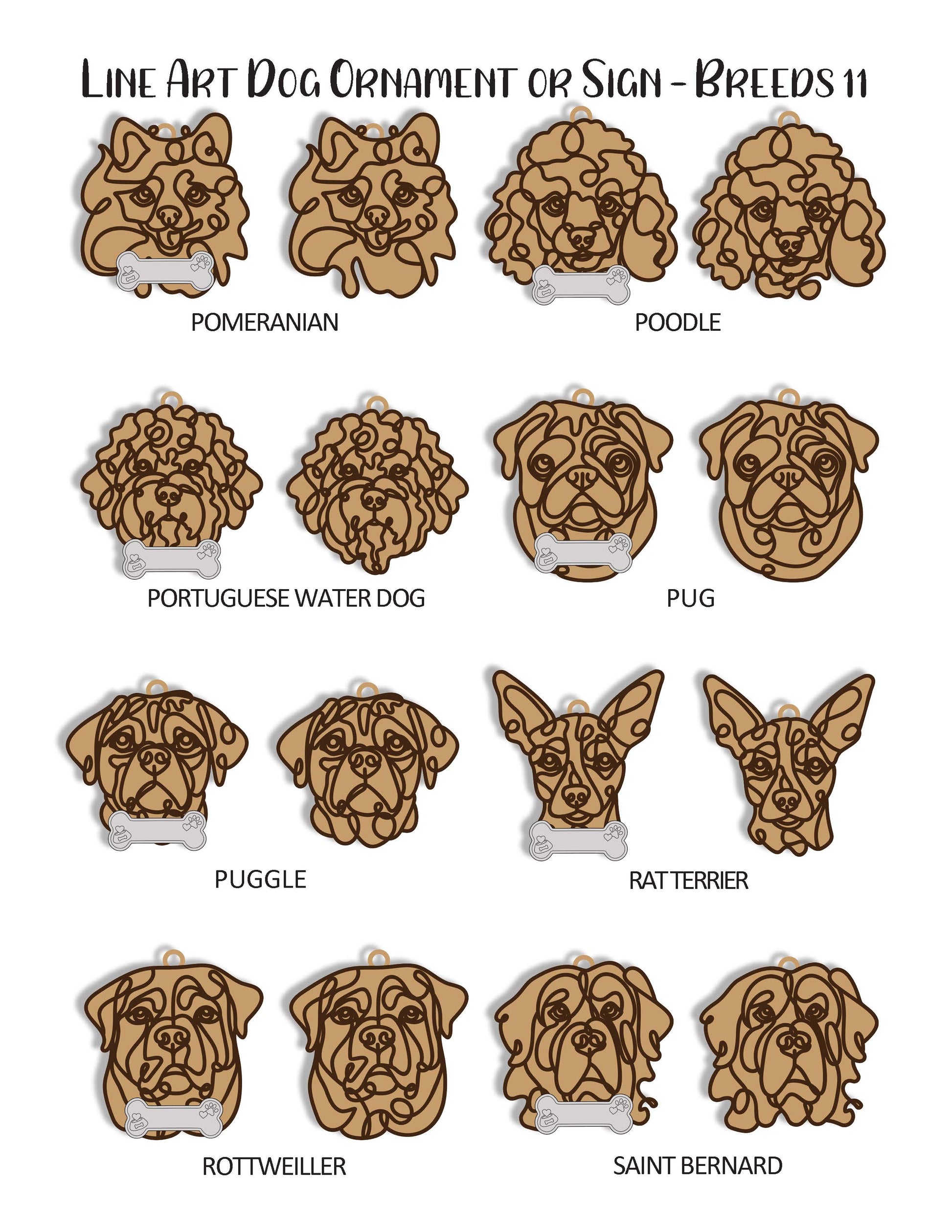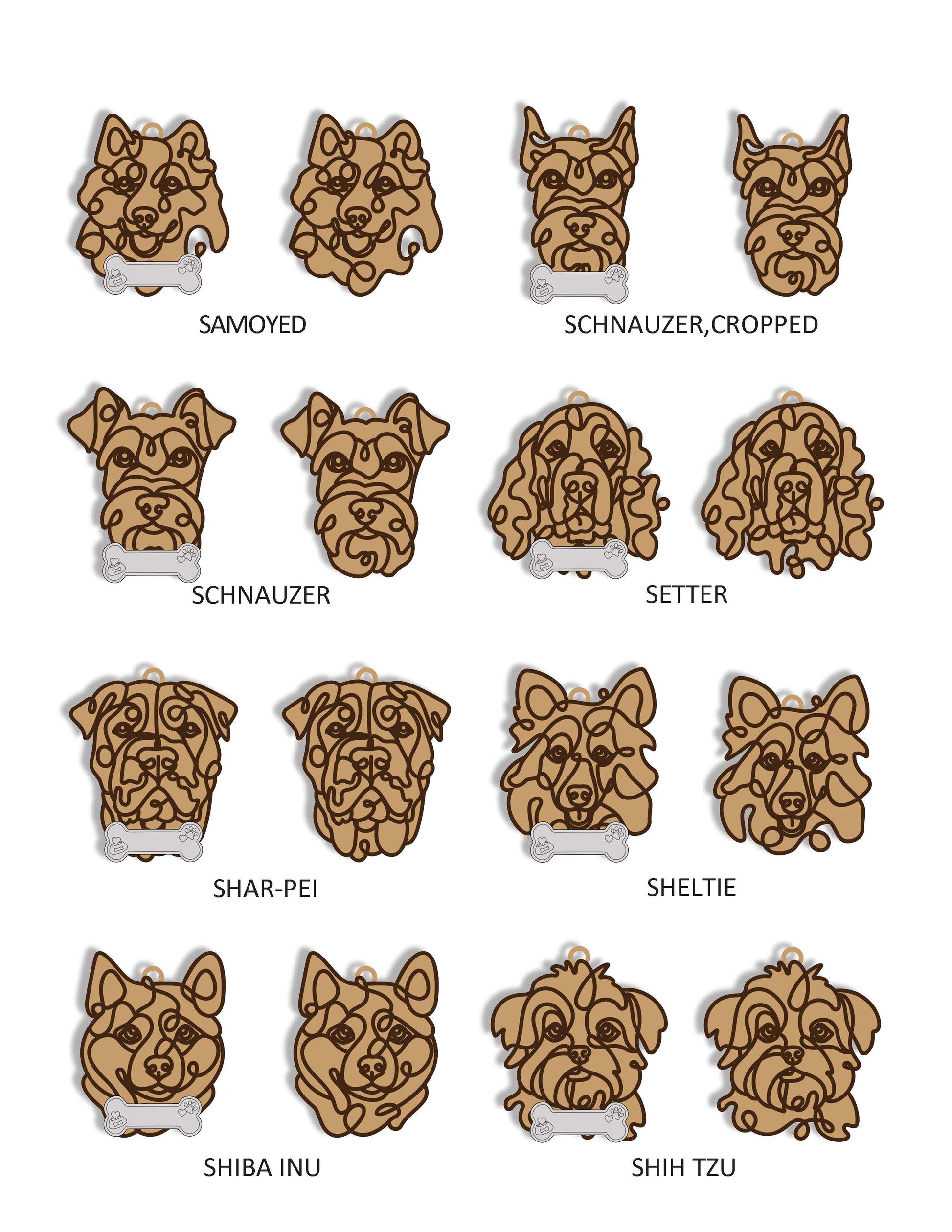 Celebrate your furry friend with our custom Doodle Dog Ornaments! Available in many different dog breeds/styles, each ornament can be uniquely personalized to match your style. Choose from four base options—maple, walnut, white, or black—and two top-layer colors, black or white. Each ornament is elegantly hung by a soft suede hanger with a single natural wood bead, adding a rustic touch to your decor. For an extra-special addition, personalize it with an optional bone featuring your dog's name. These ornaments make the perfect gift for dog lovers or a cherished addition to your holiday decor!
