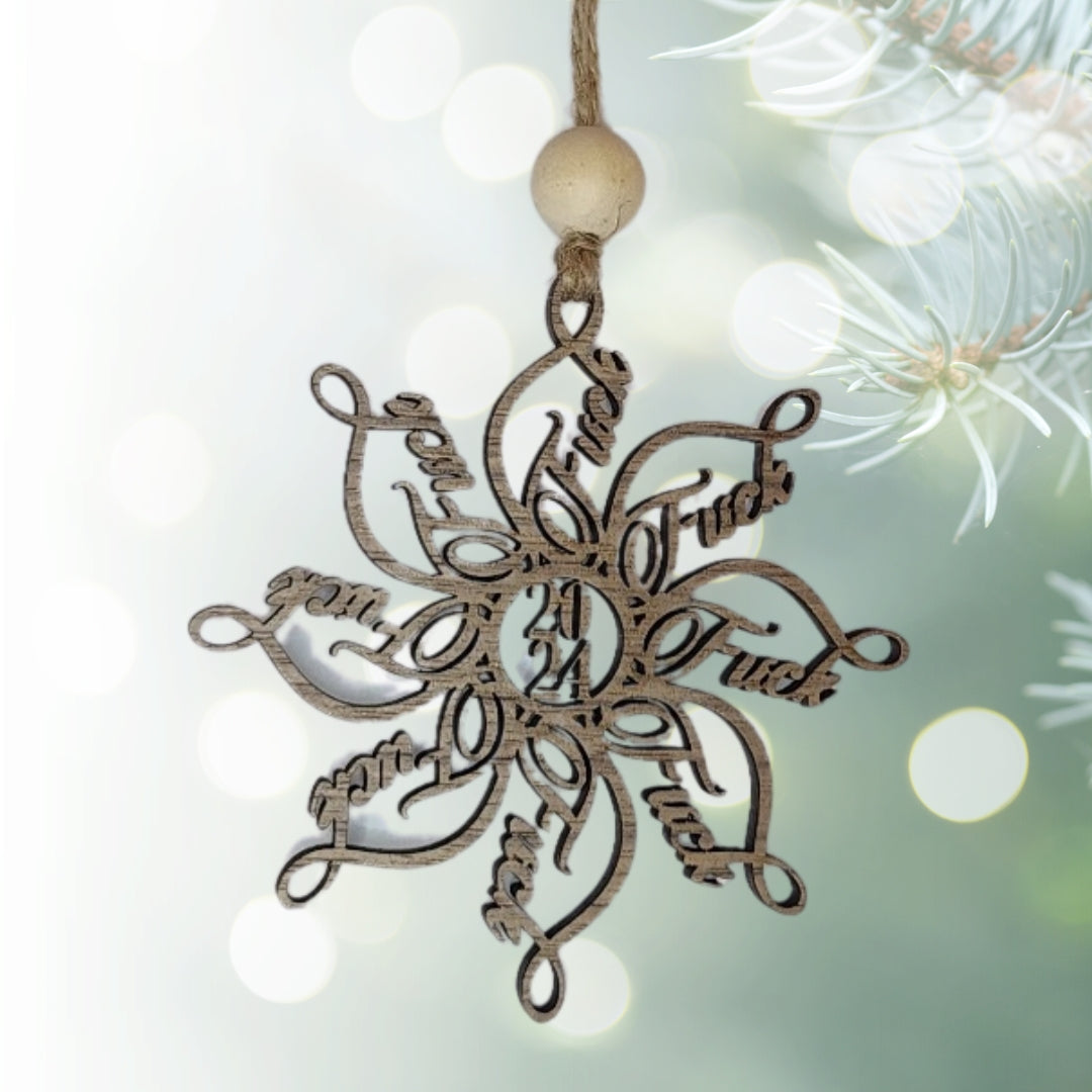 Bring some cheeky humor to your holiday decorations with our Fuckflake Ornament. This intricately designed snowflake features an edgy twist, with the word "fuck" artistically woven into its beautiful, symmetrical pattern. Crafted from high-quality wood, it’s lightweight yet sturdy, and hung with twine, complete with a natural wooden bead for a rustic finish. Perfect for adding a fun, unexpected element to your Christmas tree or as a gag gift for friends who appreciate a bit of holiday humor.