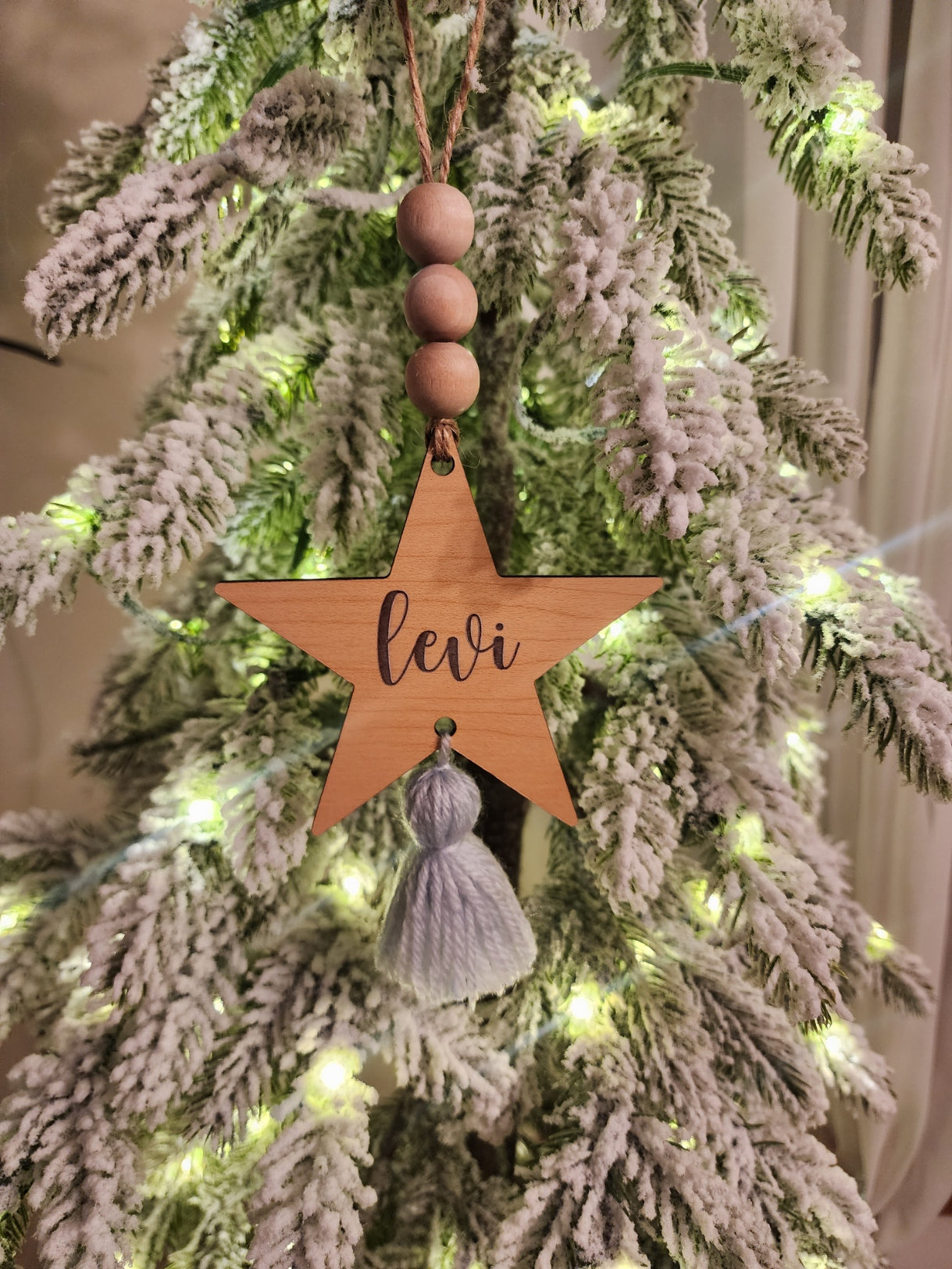 Add a personal touch to your holiday decor with our Star Ornament! Featuring your name engraved on a beautiful star, this ornament will bring a unique and heartfelt touch to your tree. Choose from a grey/blue or cream tassel to perfectly complement your holiday theme. Make this season extra special with our personalized ornament!